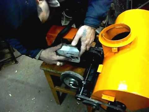 Фиксируется она к штанге мотокосы вместо рабочей головки. Крутящий момент передается через родной редуктор. Насадка представляет собой небольшой круглый корпус с колесиками, внутри которого на подшипниках вращается нож. Рабочий элемент можно собрать своими руками в форме шнека или крыльчатки с лопастями. Второй вариант проще, а первый – производительнее. Для корпуса подойдет отрезок трубы диаметром 300 мм, старый газовый баллон или пивная бочка.