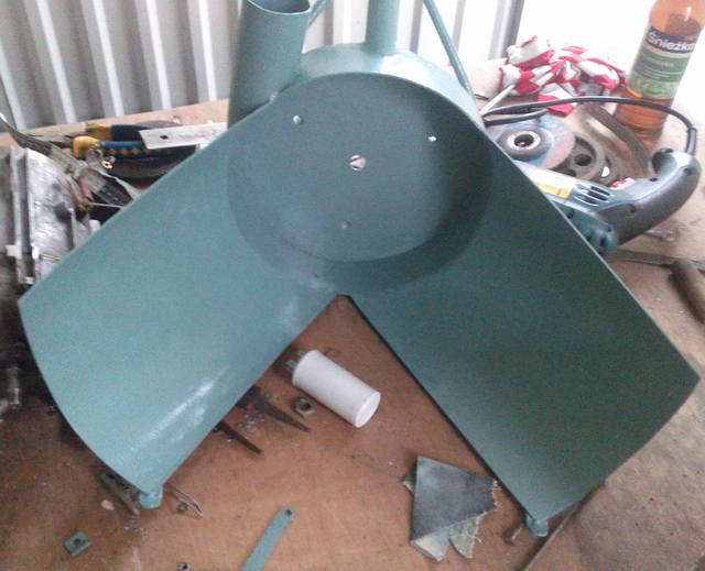 В корпусе самоделки вырезают отверстие, диаметром 10 см. Позже нужно будет приварить патрубок. Но перед этим из металлического листа вырежьте заготовку в форме полукруга и заварите ею одну часть лицевой стороны корпуса. Таким образом, заглушка не позволит разброс снега, а направит его в дефлектор. Он же должен располагаться в центральной передней части заглушки.