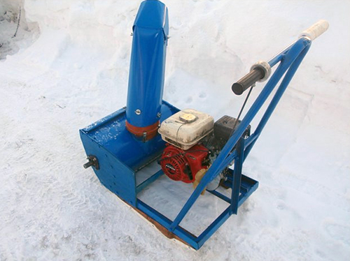 Начинающему мастеру проще своими руками собрать по чертежу роторную конструкцию. Если мощности триммера хватает, снегоуборщик усовершенствуют до двух или четырехколесной машины. Для управления устанавливают удобную П-образную ручку. На нее выносят элементы управления триммером, устанавливают топливный бак большего объема для беспрерывной работы.
