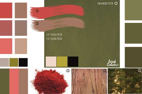 — с цветом розового дерева (17-1230 TCX)(3) – мягкий контраст, практически не привлекающий внимание. В сочетании с ализариновым и коричнево-зеленым, розовое дерево – наилучший выбор.