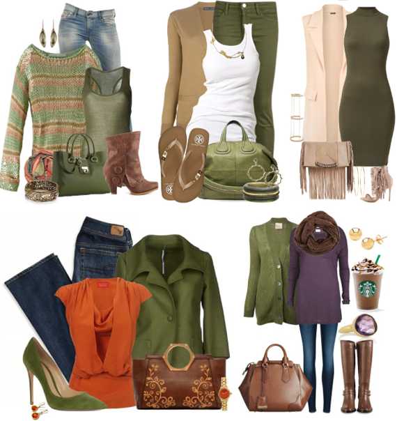 Цветом можно подчеркнуть красоту человека. Если глаза зеленые или карие, волосы темные, а кожа с оливковым тоном, в одежде обязательно нужно использовать коричнево зеленый цвет. Такой союз продиктован самой природой, сочетание естественных природных тонов позволяет создавать самобытные комплекты стиля casual, этнические костюмы.