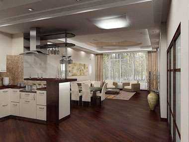 Кухня смотрится элегантно, если стены и потолок окрашены в нежные бежевые тона, а белая мебель подчеркивает шоколадный цвет ламината. Не менее эффектно выглядит комбинация белой напольной плитки и кухонной мебели орехового цвета.