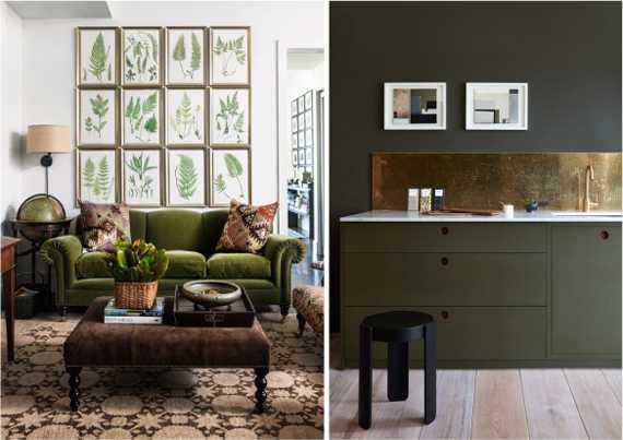 Если коричневый цвет можно отнести к черни, людям близких к земле, в постоянных трудах, то темный зеленый – цвет состояния, игры на деньги, благодушия. Совмещая эти оттенки, мы получаем цвет родового поместья, наследуемого состояния. Не зря он был популярен в английских интерьерах. Сегодня же этот тон редко встречается в интерьере, но модные тенденции на 2015 год нам рекомендуют попробовать оттенок коричнево-зеленого цвета в своей обстановке (цвет жимолость).