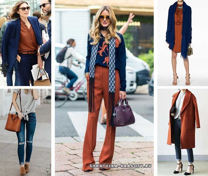 Сочетание кирпичного и синего достаточно необычное. Ведь происходит столкновение теплого и холодного тонов. Но это делает его более привлекательным, так что смело можно надевать такую одежду. Причем рыжий в этом комплекте выглядит особенно глубоким и сложным.