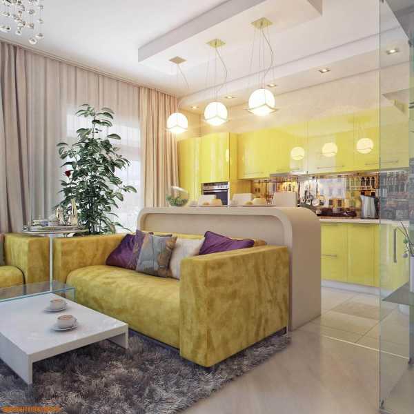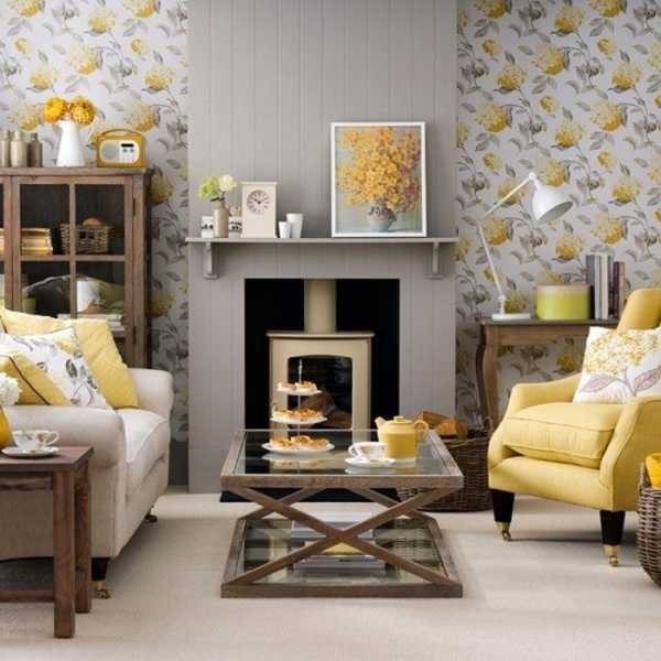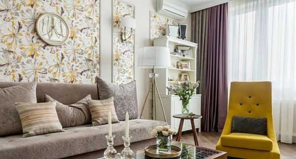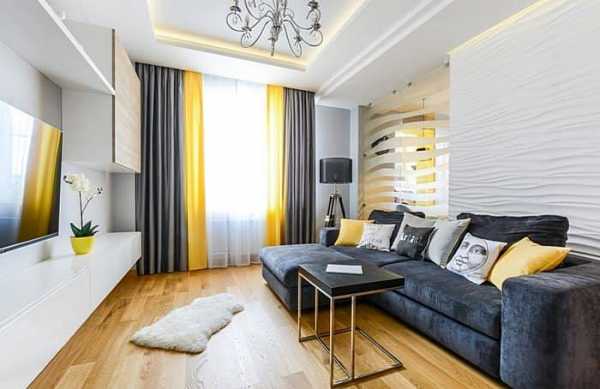 Отлично декорировать небольшую по площади гостиную возможно благодаря серо-желтой цветовой гамме.