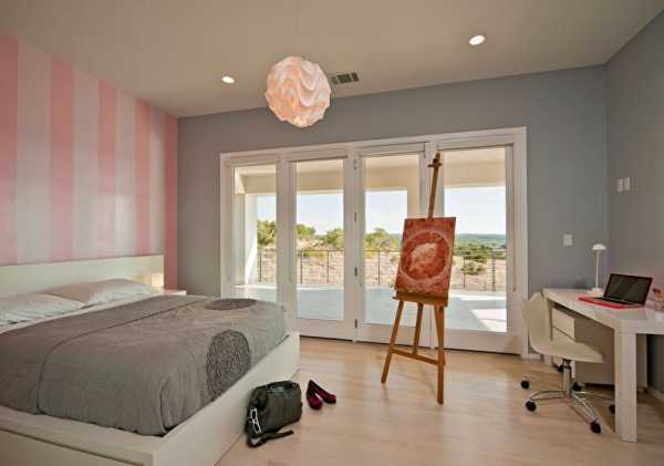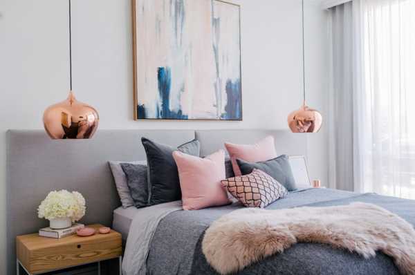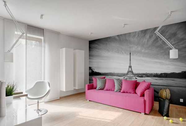 Жизнерадостный оттенок весенних цветов на сером фоне как будто светится изнутри, делая обстановку романтической и немного легкомысленной. Розовые элементы интерьера наверняка понравятся девушкам с мягким женственным характером. Также это хороший вариант для оформления детской комнаты маленькой принцессы.
