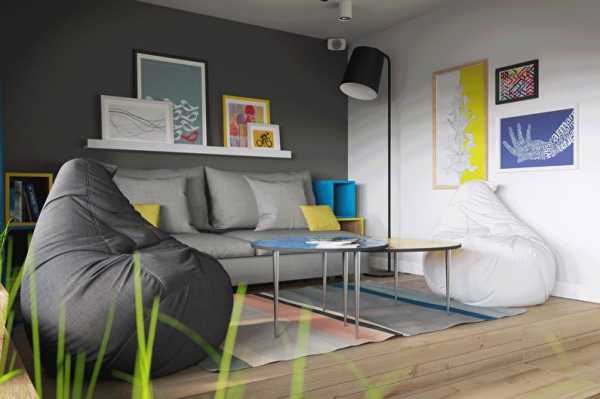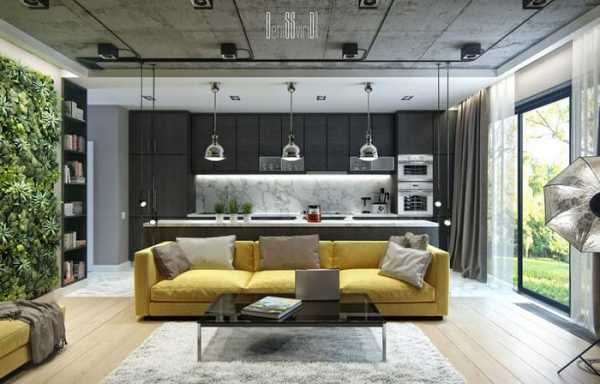 В просторной или совмещенной с кухней комнате есть возможность поэкспериментировать с несколькими тонами серого, в том числе с темным угольно-серым. Дополненный крупным и разнообразным мелким декором желтого цвета, интерьер получается живым и объемным.