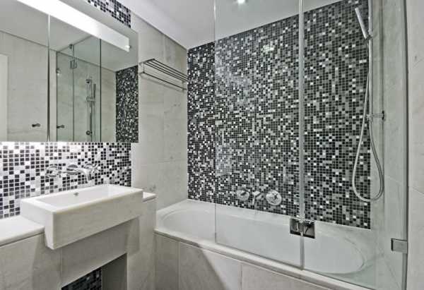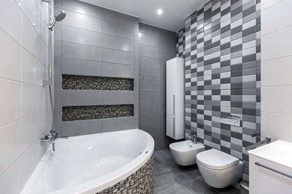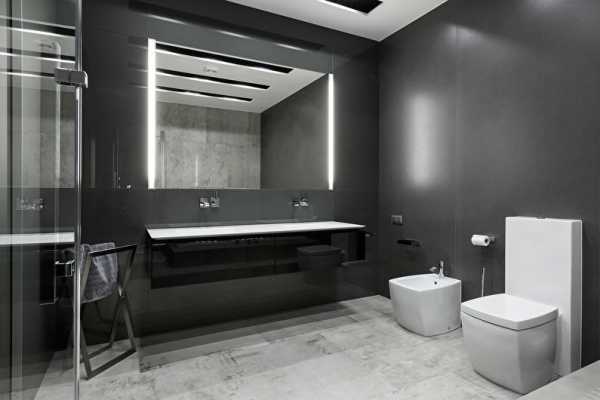 Отделка в серых тонах — очень практичное решение для ванной, ведь на такой поверхности почти не видны брызги воды или пятна от высохшего конденсата. Но при выборе оттенка стоит учитывать размер помещения — чем меньше площадь ванной комнаты, тем светлее должна быть краска или плитка, причем серый желательно дополнить белым глянцем сантехники и использовать побольше зеркал.