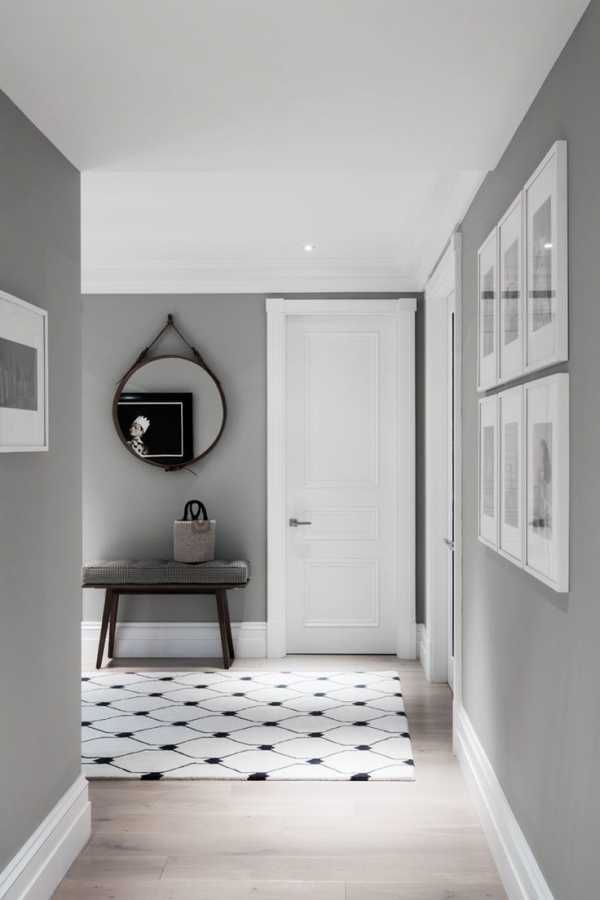 Так как в коридоре или прихожей почти никогда нет естественного освещения, то в таком случае там обязательно нужно установить несколько ярких лампочек и повесить большое зеркало. Также рекомендуется белый потолок и минимальное (либо полное отсутствие) контрастных цветовых сочетаний.
