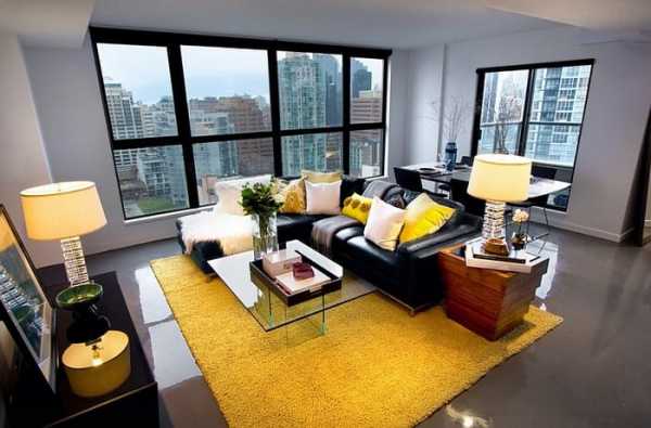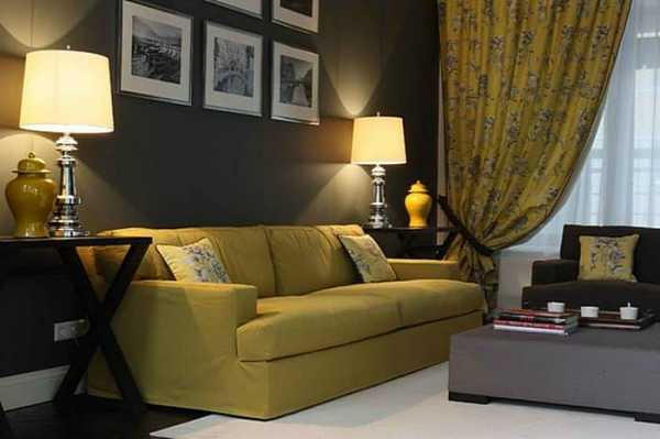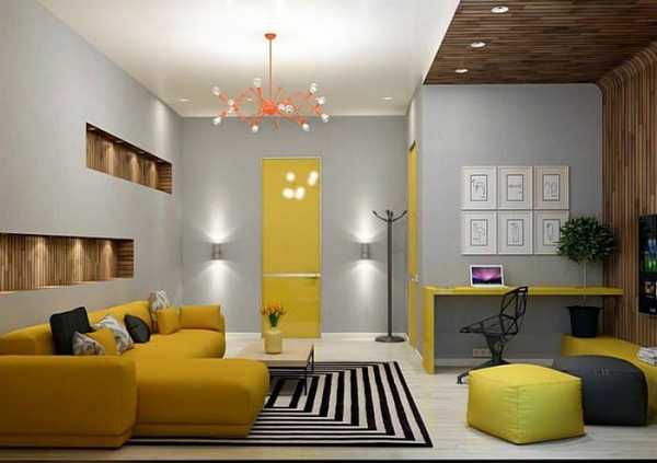 Интересный интерьер гостиной в серо-желтых тонах, что точно по особенному преобразит комнату такого плана.