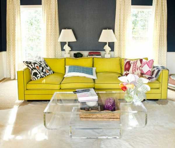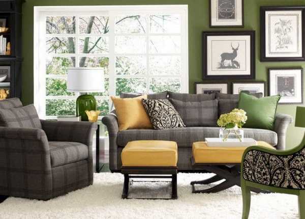 Если окна гостиной выходят на солнечную южную сторону, желтого используйте поменьше, иначе атмосфера будет душноватой. И оттенок желтого здесь нужен особый, содержащий освежающий зеленый подтон. Зеленовато-желтых оттенков несколько – от бледного до яркого. Смотрятся они как нечто среднее между желтым и зеленым и воспринимаются как слегка прохладные, в отличие от чистого желтого, имеющего теплую «температуру».