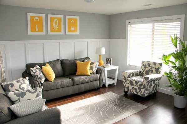 Симпатичный интерьер гостиной в желто-серых тонах, что позволяет создать полную свободу в декорировании комнаты.