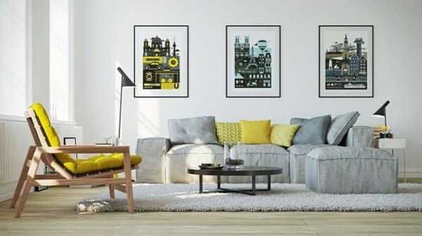 Просто прекрасный интерьер в гостиной создан благодаря таким ярким желтым акцентам на фоне серого.