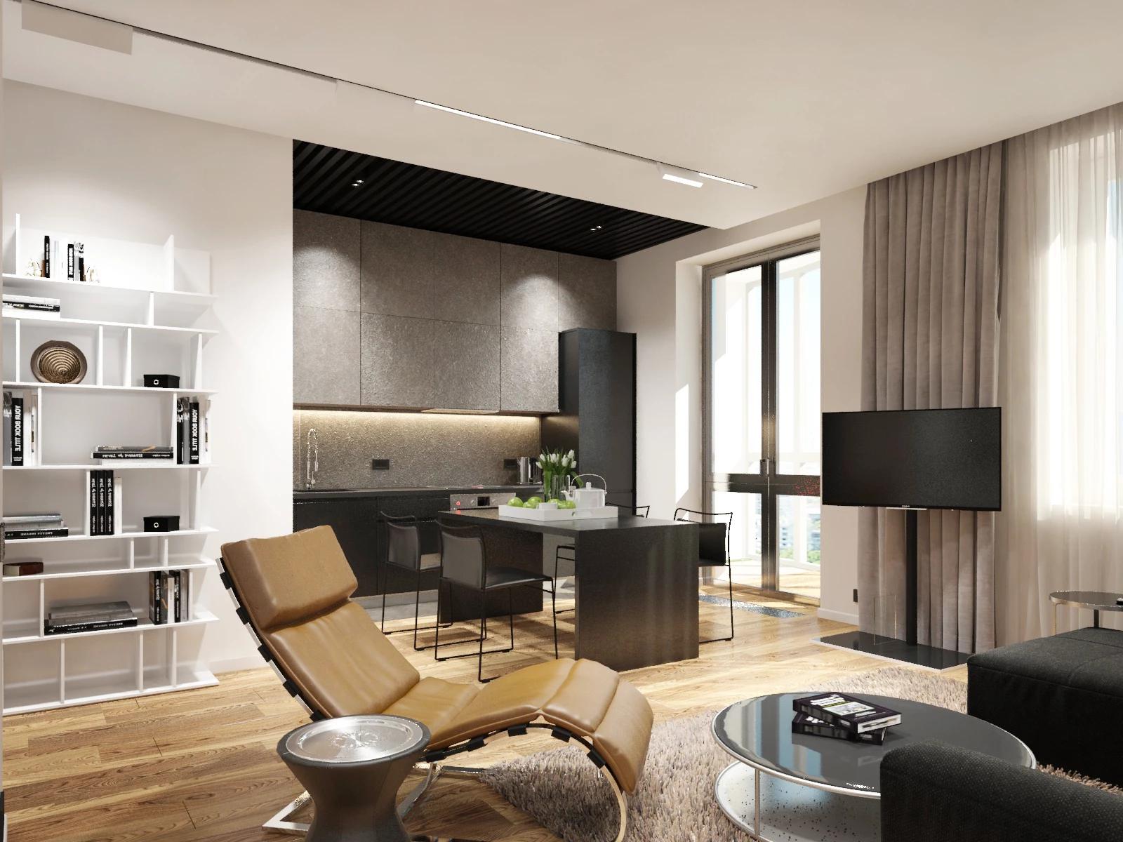 Минимум мебели, в качестве декора – панорамные окна, пропускающие много естественного света, в качестве планировочного решения – организация студийного интерьера.