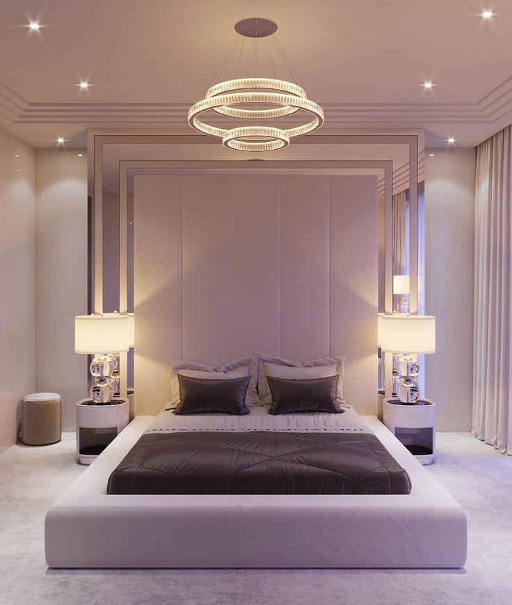 Шестое – немного о потолке. Традиционно – белый потолок, но если позволяет высота, можно сделать его многоуровневым, освещенным из глубины. Иногда предпочитают фосфоресцирующую модель неба. Да и освещение должно не слепит вам глаза. Лучше чтобы было несколько источников света. Люстра, бра или небольшой ночничок у кровати.