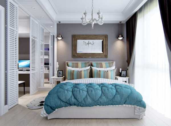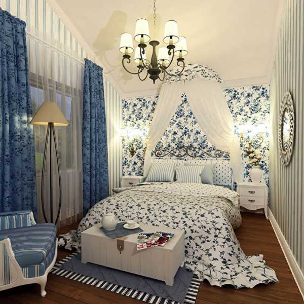 Прекрасно смотрится спальня в средиземноморском направлении. Бело-голубой цвет визуально расширит помещение, а песчаный — придаст тепла и уюта.
