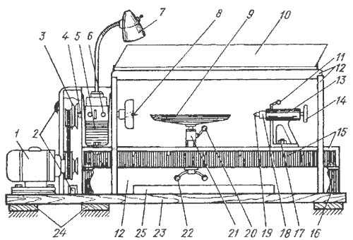 1 — передняя бабка, 2 — планшайба, навернутая на шпиндель, 3 — задняя бабка, 4 — суппорт на стойке