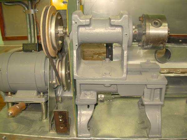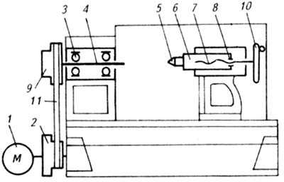 На левой стороне станины прочно закреплена неподвижная передняя бабка с вращающимся в подшипниках шпинделем, имеющем коническое отверстие, в которое вставляется стальная гребенка или центр. На конце наружной поверхности шпинделя сделана резьба для навертывания на него патрона или планшайбы.