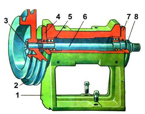 На этом рисунке изображена конструкция шпинделя, расположенного в передней бабке. Шпиндель представляет собой вал, на который посредством ременной передачи передается вращение от двигателя.