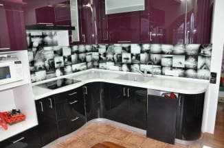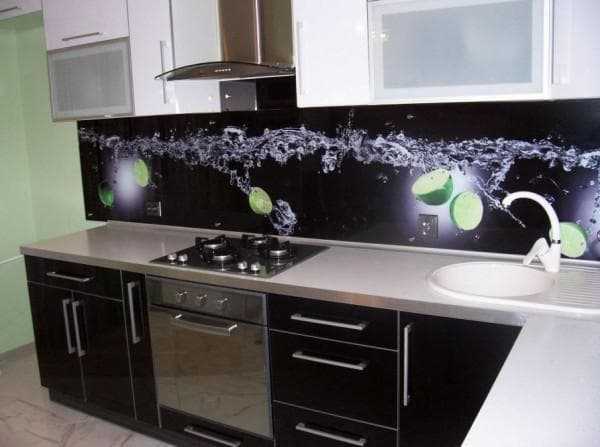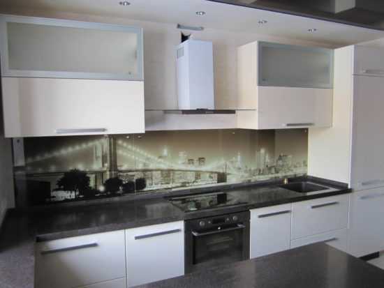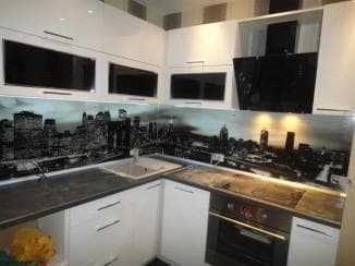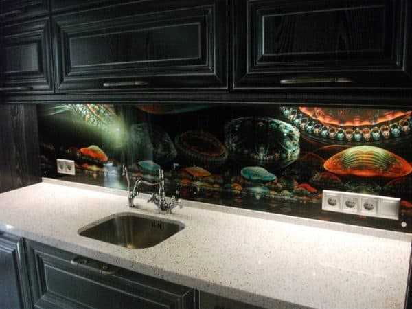 - скинали – стекло с подложкой. Это может быть обычная виниловая пленка, наклеенная с обратной стороны (и поэтому полностью защищена от воды и пара), или фотопечать. Последний вариант намного дороже, но гораздо долговечнее и интереснее, если судить по отзывам обладателей такого фартука.