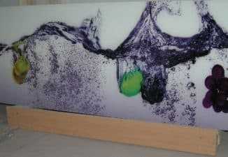 Одна из альтернатив декорирования защитных поверхностей своими руками – это роспись. Роспись подразумевает рисунок на стекле красками, которые не растекаются и не облазят. Изготовление фартуков для кухни из стекла при помощи росписи подразумевает нанесения орнамента или росписи на тыльную сторону. Сушатся краски не менее суток. Для насыщенного цвета наносится 2-3 слоя масляных красок.
