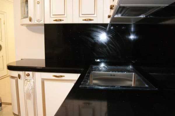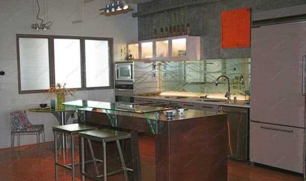 Так что для скинали применяют стекло особенное. На дизайн этот фактор совершенно не влияет, но стоимость фартука повышается.
