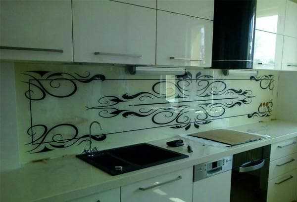 На фото — стекло с матовым рисунком.Материалы для фартука