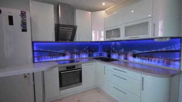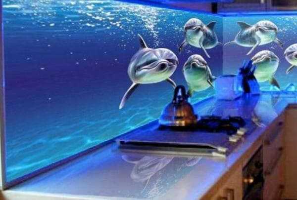 На фото — «подводный мир» с подсветкой.Установка скинали очень редко осуществляется своими руками: такой экран долго изготавливается – от 2 до 4 недель, стоит изрядную сумму и обычно отличается очень большими размерами. Соответственно, затевать установку светодиодной ленты своими руками смысла не имеет. Монтаж подсветки несущественно повышает цену работы.