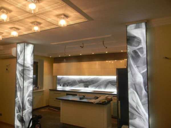 На фото — скинали с фотопечатью.Ну и, конечно, любой такой вариант можно значительно украсить, использовав светодиодную подсветку.