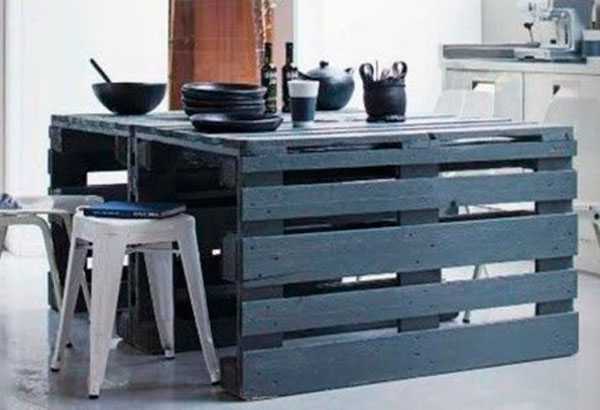 Если у вас в распоряжении нет достаточного количества одинаковых поддонов, чтобы сделать стол просто сложив их, или вы хотите сделать другие варианты, то это тоже не проблематично. Ведь в поддонах между досками есть кубики, комбинируя их можно создать красивые столы из паллет своими руками.