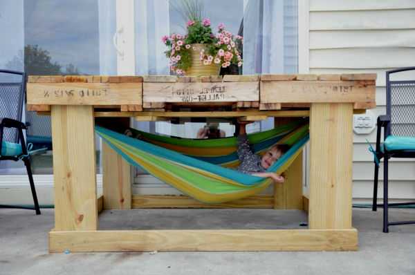Отличная мысль эксплуатации стола созданного из поддонов, ниже столешницы закрепляется небольшой гамак, в котором ребенок может спокойно отдыхать. Для улицы данное решение еще актуально за счет того, что столешница будет создавать тень, соответственно ребенок не перегреется на солнце.