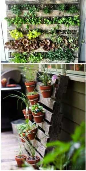 Горшки с любимыми цветами можно закрепить на деревянных паллетах, в итоге получится такое яркое, живое, импровизированное цветочное панно.