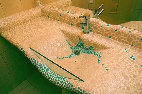 Идея понравится тем, кто предпочитает индивидуальность в интерьерах и готов поработать над обустройством ванной своими руками. Прелесть этого решения в том, что можно вырезать столешницу любой конфигурации и оформить ее по собственному усмотрению. Отлично смотрится мозаичный декор. Рисунок можно выложить из керамических черепков, осколков стекла, зеркала или купить уже в готовом плиточном виде.