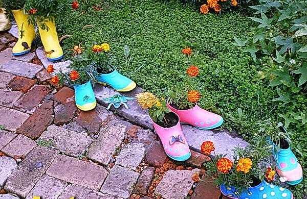 В обустройстве ландшафтного дизайна могут участвовать старые ботинки и сумки. Данные предметы наполняются землей и развешиваются по всему участку. В таких интересных клумбах отлично растет лобелия и петунья.
