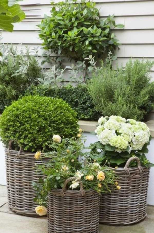 - Ненужные плетеные корзинки – ими можно украсить, крыльцо дома. Единственное, прежде чем засыпать в них почву следует тщательно обработать антисептическим средством, что позволит использовать изделие как минимум несколько лет.