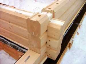 Обычно первый венец укладывают на доски, это необходимо для того чтобы избежать попадания воды на брус.- Поддерживающие доски обрабатывают антисептическим составом. Они выступают как бы связующим звеном между нижним венцом и фундаментом. Под доски подкладывают гидроизоляционный материал, он обеспечит защиту от влажности со стороны грунта.