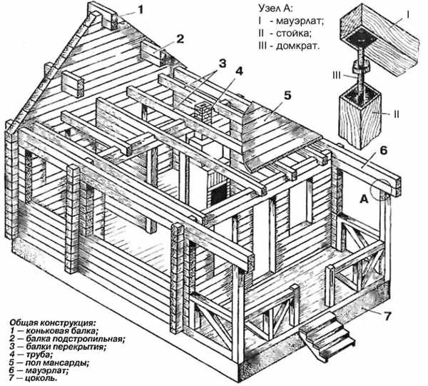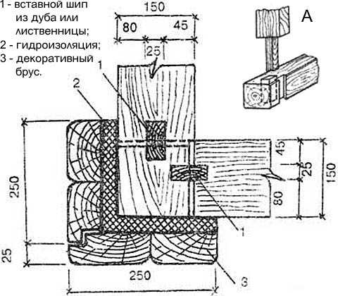 Общая схема устройства брусового дома с мансардой дана на рис. ниже. Собран он может быть не только рубленым. Если вы не планируете ничего сложнее постройки сезонного одноэтажного дома до прим. 6х6 м в плане из бруса 150х150, то возможно применение балочно-брусовой техники строительства. При этом по углам и под простенки в закладной (самый нижний) венец коробки, которая в данном случае не сруб, ставят на шипах строевые, т.е. вертикальные брусья, поз. А в чертеже на рис. справа.