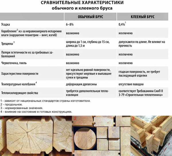 Сравнительные характеристики цельного выдержанного и клееного профильного бруса даны в табл. на рис., а как это выглядит натурально, показано на фото там же внизу. Добавить к данным табл. и снимкам остается немного.