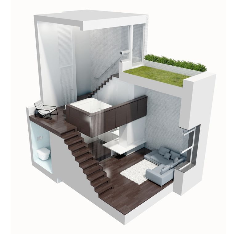 Квартиры с потолками, высота которых превышает четыре метра, можно преобразовать в двухуровневые студии. На основном этаже располагается место для готовки и гостевая зона. Второй ярус выделен под спальню. Даже если в комнате много гостей, один из проживающих всегда сможет подняться наверх и побыть в одиночестве.