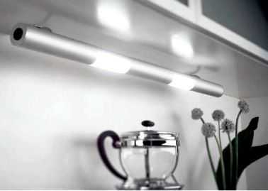 - Кухня. Удобнее всего для хозяйки и всей семьи будет, если светодиодные элементы будут освещать определённую часть кухни как дополнительный источник освещения. При этом в качестве основного метода освещения отдайте предпочтение другим типам светильников. Единственный момент, который обязательно нужно учесть — это расстояние от конфорок до светодиода. Поднимающийся воздух должен проходить мимо ламп, чтобы не допустить их перегрева. Даже в самых крайних случаях лампа не должна приближаться к источнику тепла ближе, чем на 1 метр.