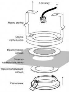 Лампа вставляется за счет того, что кольцо разжимается и входит в канавку, находящуюся в корпусе. Это светильник подойдет как для светодиодных ламп, так и галогеновых. Только не стоит забывать про напряжение питания, которое могут выдержать светильники. Чтоб закрепить светильник в потолке, необходимо в месте расположения светильника проделать отверстие, которое будет чуть меньше наружного диаметра фланца корпуса.