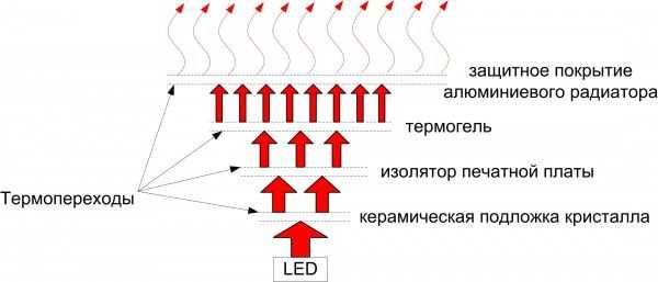 Схема теплоотведения при помощи радиатора состоит из нескольких частей: сначала тепло от самой лампы передаётся керамической подложке кристалла, затем оно передаётся изолятору печатной платы, после чего проходит через термогель и, наконец, попадает в радиатор.