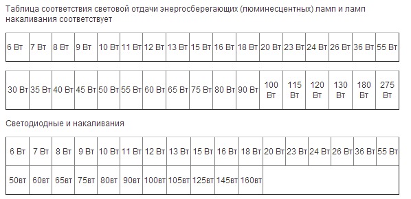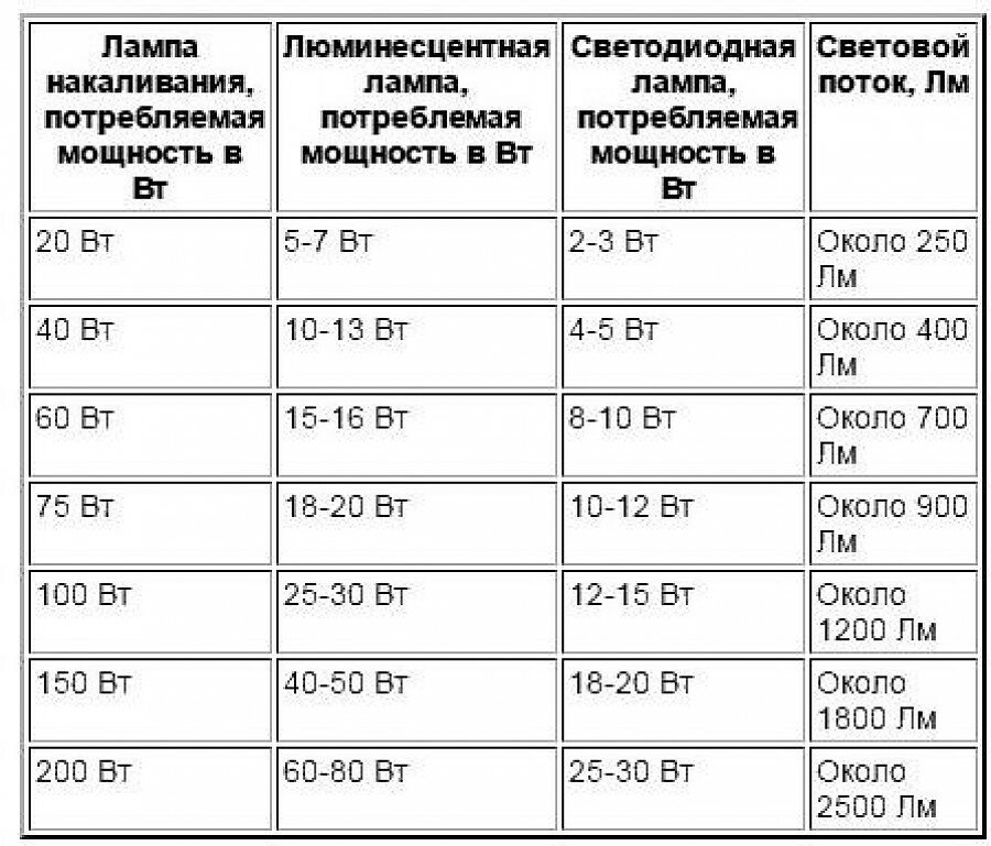 Соотношение мощностей светодиодных ламп и накаливания, таблица