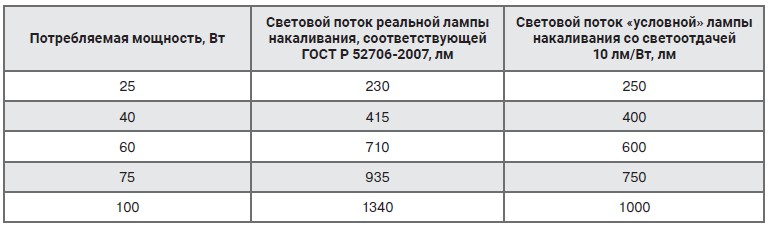 Обустраивая освещение с заменой устаревших осветительных приборов на новые, более экономичные, требуется подобрать им эквивалент: