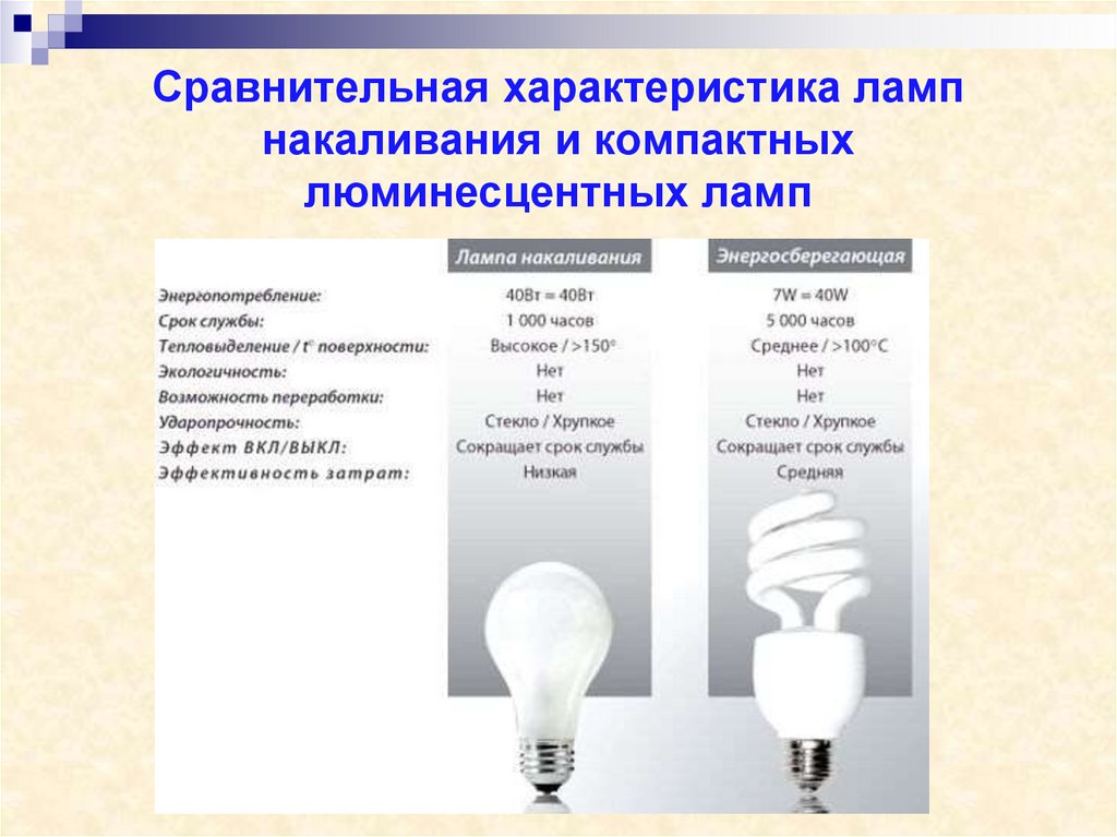 Сравнительная таблица Лампы накаливания 40W, люминесцентной 15W и светодиодной лампы 5W