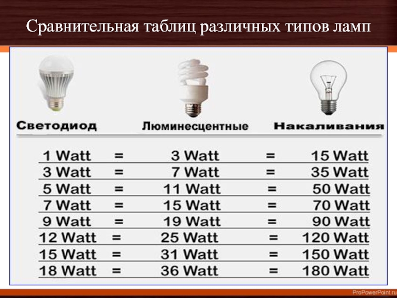 Соответствие ламп накаливания и светодиодных ламп: таблица