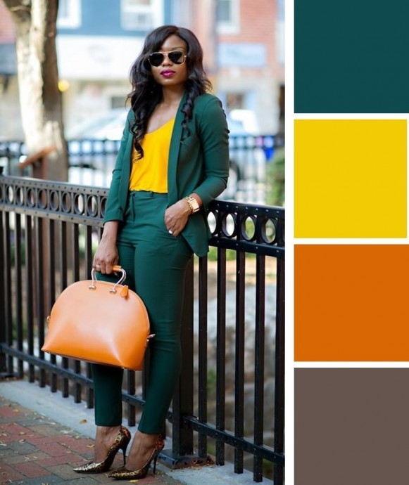 Сочетание темно-зеленого в одежде с теплыми цветами считается самым эффектным и выразительным.