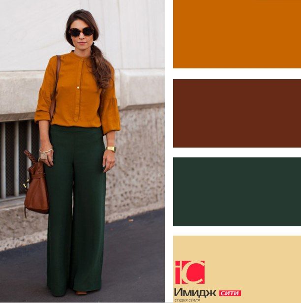 Сочетание темно-зеленого в одежде с теплыми цветами считается самым эффектным и выразительным.
