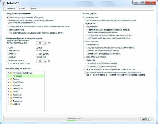 В базе данных имеются все необходимые характеристики для населенных пунктов нашей страны, достаточно лишь выбрать нужный. Также необходимо выбрать тип конструкции: наружная стена, мансардная кровля, перекрытие над холодным подвалом или чердачное.