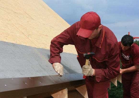 Π’.ΠΊ. ΡΠΎΡΡΠ΅Π²Π°Ρ ΠΏΠ»Π°Π½ΠΊΠ° Π·Π°Π²Π΅ΡΡΠ°Π΅Ρ ΡΠΈΠΊΠ» ΠΏΠ΅ΡΠ΅ΠΊΡΡΡΠΈΡ ΠΊΡΡΡΠΈ, ΡΠΎ ΠΏΠ΅ΡΠ΅Π΄ Π΅Π΅ ΡΡΡΠ°Π½ΠΎΠ²ΠΊΠΎΠΉ ΠΏΡΠΎΠ²ΠΎΠ΄ΠΈΡΡΡ ΡΡΠ΄ ΠΏΡΠ΅Π΄Π²Π°ΡΠΈΡΠ΅Π»ΡΠ½ΡΡ ΡΠ°Π±ΠΎΡ. ΠΠ° ΡΡΠΎΠΌ ΡΡΠ°ΠΏΠ΅ ΠΎΠ±ΡΠ·Π°ΡΠ΅Π»ΡΠ½ΠΎ ΠΌΠΎΠ½ΡΠΈΡΡΠ΅ΡΡΡ ΠΊΠ°ΡΠ½ΠΈΠ·Π½Π°Ρ ΠΏΠ»Π°Π½ΠΊΠ°. ΠΠΎ ΠΏΠ΅ΡΠ΅Π΄ Π΅Π΅ ΡΠΈΠΊΡΠ°ΡΠΈΠ΅ΠΉ Π½Π° ΡΡΡΠΎΠΏΠΈΠ»Π°Ρ ΠΊΡΠ΅ΠΏΡΡΡΡ ΠΈΠ·Π³ΠΎΡΠΎΠ²Π»Π΅Π½Π½ΡΠ΅ ΠΈΠ»ΠΈ ΠΏΡΠΈΠΎΠ±ΡΠ΅ΡΠ΅Π½Π½ΡΠ΅ ΠΊΡΡΠΊΠΈ Π΄Π»Ρ ΡΠ΄Π΅ΡΠΆΠ°Π½ΠΈΡ ΠΊΠΎΠΌΠΏΠ»Π΅ΠΊΡΡΡΡΠΈΡ Π²ΠΎΠ΄ΠΎΡΡΠΎΡΠ½ΡΡ ΡΠΈΡΡΠ΅ΠΌΡ. ΠΠ°Π΄ Π½ΠΈΠΌΠΈ ΡΠΏΠ΅ΡΠΈΠ°Π»ΡΠ½ΡΠΌΠΈ ΡΠ°ΠΌΠΎΡΠ΅Π·Π°ΠΌΠΈ ΠΏΠΎΠ΄ ΠΌΠ΅ΡΠ°Π»Π»ΠΎΡΠ΅ΡΠ΅ΠΏΠΈΡΡ ΠΊ ΠΊΠ°ΡΠ½ΠΈΠ·Π½ΠΎΠΉ ΠΈ Π»ΠΎΠ±ΠΎΠ²ΠΎΠΉ Π΄ΠΎΡΠΊΠ΅ ΠΏΡΠΈΠ±ΠΈΠ²Π°Π΅ΡΡΡ ΠΊΠ°ΡΠ½ΠΈΠ·Π½Π°Ρ ΠΏΠ»Π°Π½ΠΊΠ°. Π’ΠΎΠ»ΡΠΊΠΎ ΠΏΠΎΡΠ»Π΅ ΡΡΠΎΠ³ΠΎ ΠΌΠΎΠΆΠ½ΠΎ ΠΏΡΠΈΡΡΡΠΏΠ°ΡΡ ΠΊ ΡΠΊΠ»Π°Π΄ΠΊΠ΅ ΡΠΈΠ½ΠΈΡΠ½ΠΎΠ³ΠΎ ΠΏΠΎΠΊΡΡΡΠΈΡ (ΠΌΠ΅ΡΠ°Π»Π»ΠΎΡΠ΅ΡΠ΅ΠΏΠΈΡΡ). Π€ΡΠΎΠ½ΡΠ°Π»ΡΠ½ΡΠΉ ΠΆΠ΅ ΡΠ»Π΅ΠΌΠ΅Π½Ρ ΠΊΡΠΎΠ²Π΅Π»ΡΠ½ΠΎΠΉ ΡΠΈΡΡΠ΅ΠΌΡ Π²Π΅Π½ΡΠ°Π΅Ρ Π²ΡΠ΅ ΠΏΡΠ΅Π΄ΡΠ΄ΡΡΠΈΠ΅ ΡΠ°Π±ΠΎΡΡ ΠΈ Π·Π°ΠΊΡΠ΅ΠΏΠ»ΡΠ΅ΡΡΡ Π½Π° ΠΏΠΎΠ»Π½ΠΎΡΡΡΡ ΠΏΠΎΠΊΡΡΡΡΠ΅ ΠΊΡΠΎΠ²Π΅Π»ΡΠ½ΡΠΌ ΠΌΠ°ΡΠ΅ΡΠΈΠ°Π»ΠΎΠΌ ΡΠΊΠ°ΡΡ. ΠΠ½ ΠΌΠ°ΡΠΊΠΈΡΡΠ΅Ρ Π²ΡΠ΅ ΡΠΎΡΡΡ, Π·Π°ΠΊΡΡΠ²Π°Π΅Ρ Π΄ΠΎΡΡΡΠΏ ΠΊ ΠΏΡΠΎΡΡΡΠ°Π½ΡΡΠ²Ρ ΠΏΠΎΠ΄ ΠΊΡΠΎΠ²Π»Π΅ΠΉ Π²Π΅ΡΡΡ ΠΈ ΠΎΡΠ°Π΄ΠΊΠ°ΠΌ.